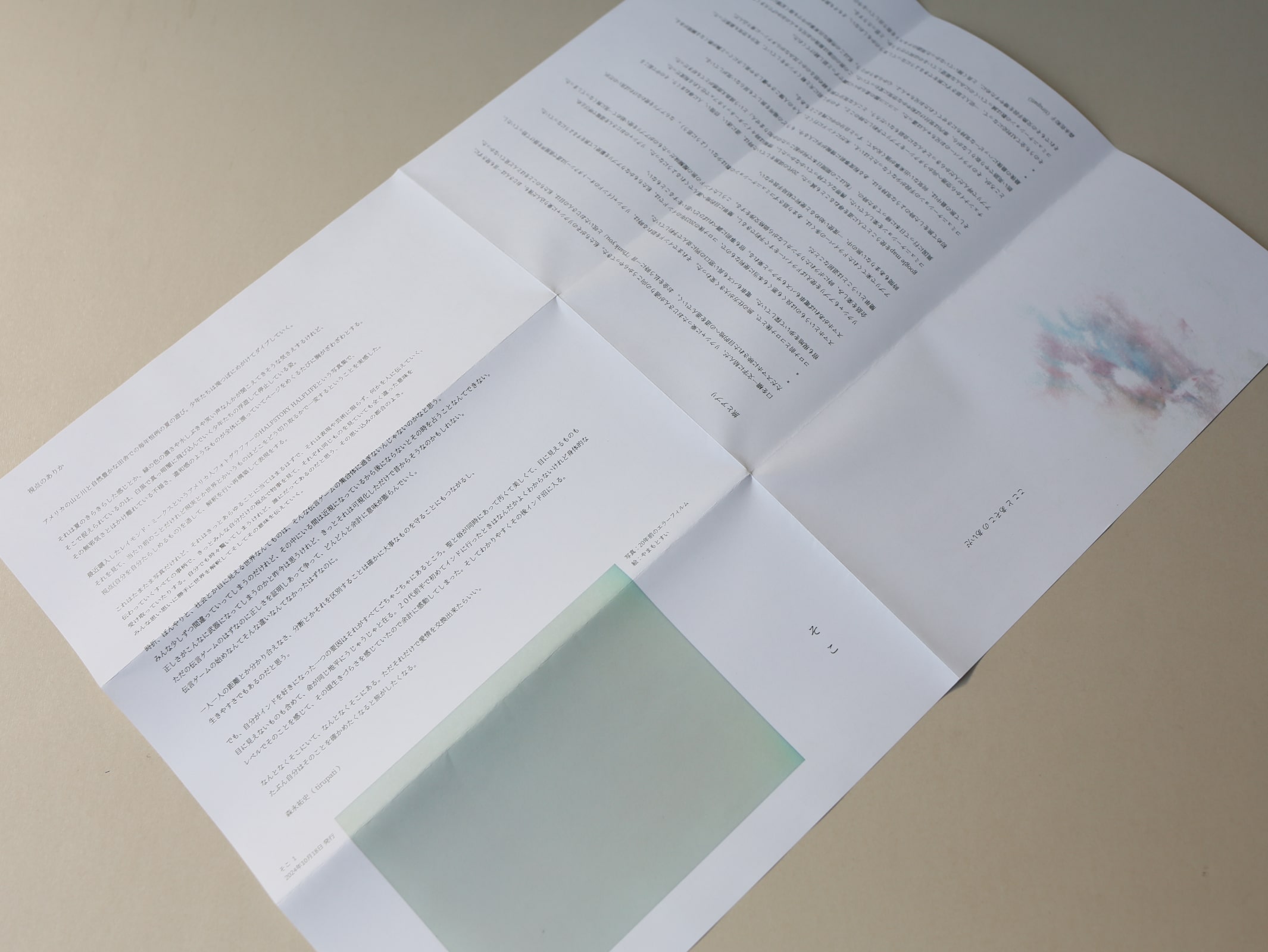 その揺れ動く領域のことを頭において、冊子を作る中で、この冊子で僕自身の境界に揺らぎを与えてみるのも面白そうだと、思いはじめました。僕自身が話をしてみたい人や、なにかを共にしたいなと思う人に、この小さな読み物を送ってみるのはどうだろうか?友人や仕事の関係とは、少し違った、不思議な関係が生まれるのでは、などと夢想しました。