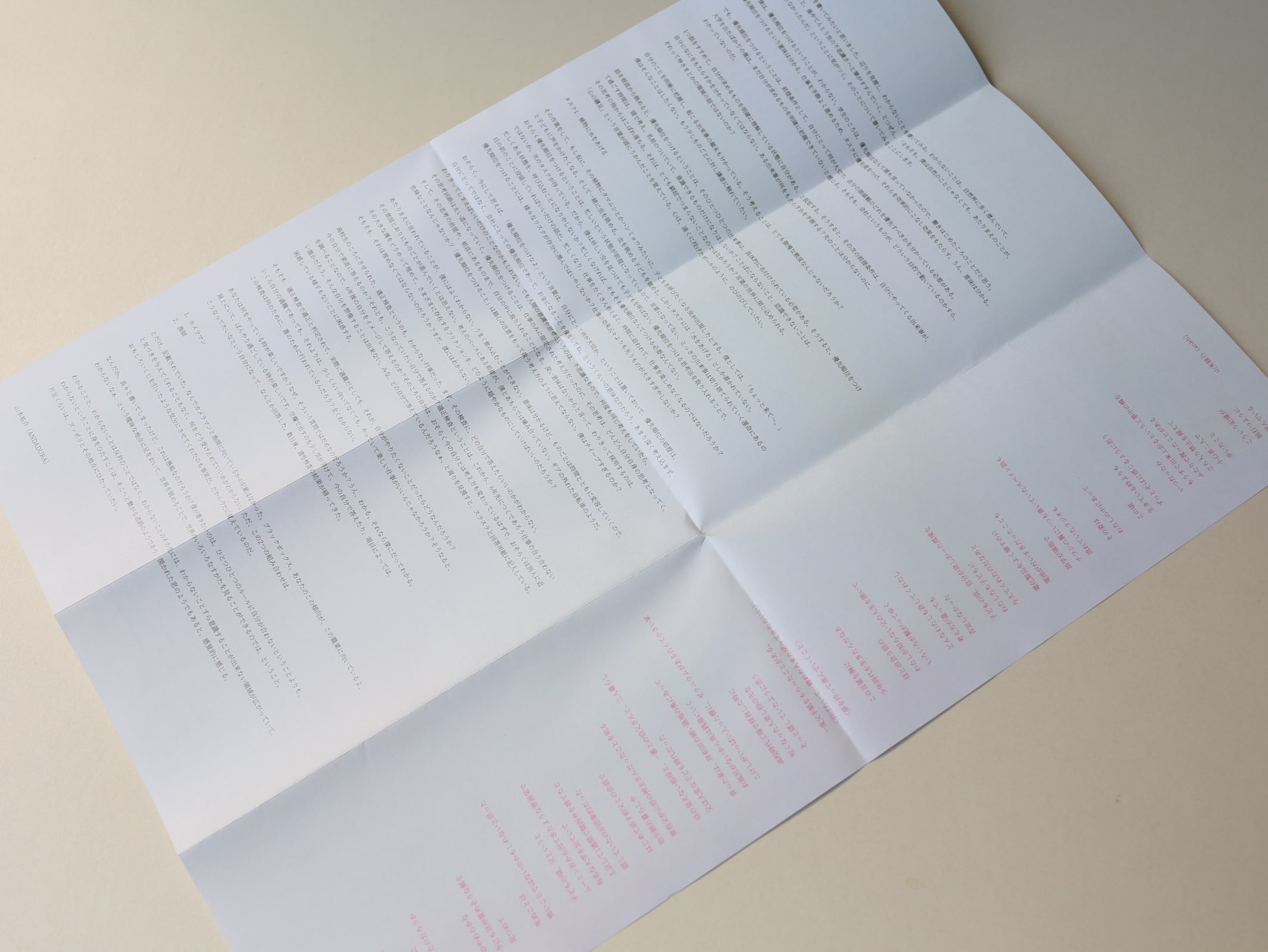 というわけで、ふっと思いついた人や、気になっている方に勝手にメッセージを送りつけたりしました。こういう仕事でもないし、遊びでもない、よく分からないイレギュラーな行為は、新鮮な気分にさせてくれる。まぁ、楽しみを見つける遊びに近いのかもしれません。冊子遊び。文通ってやったことないけど、きっとこんな楽しさなんだろうな。