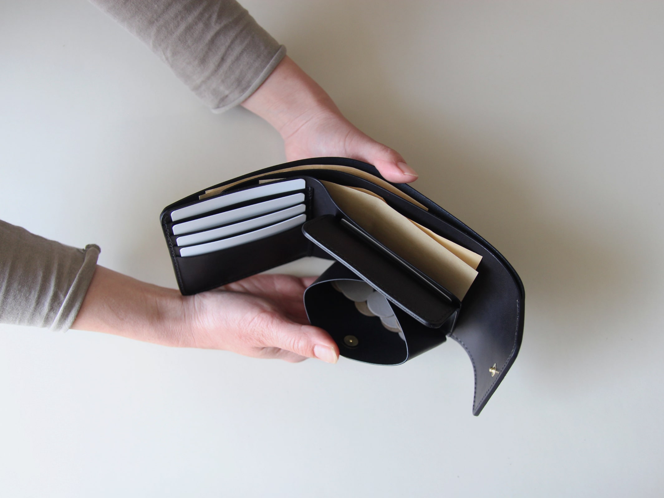 左手で持った時に、小銭入れが真ん中にある事で、安定して持つ事が出来ます。
