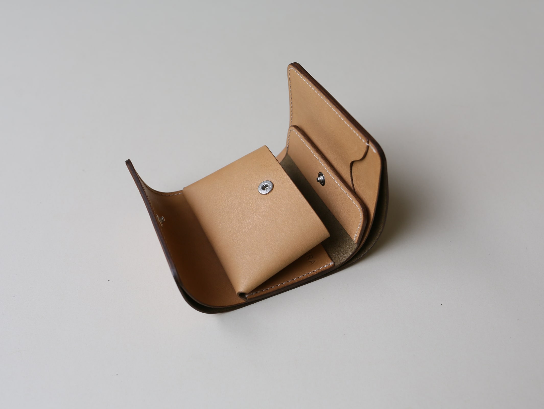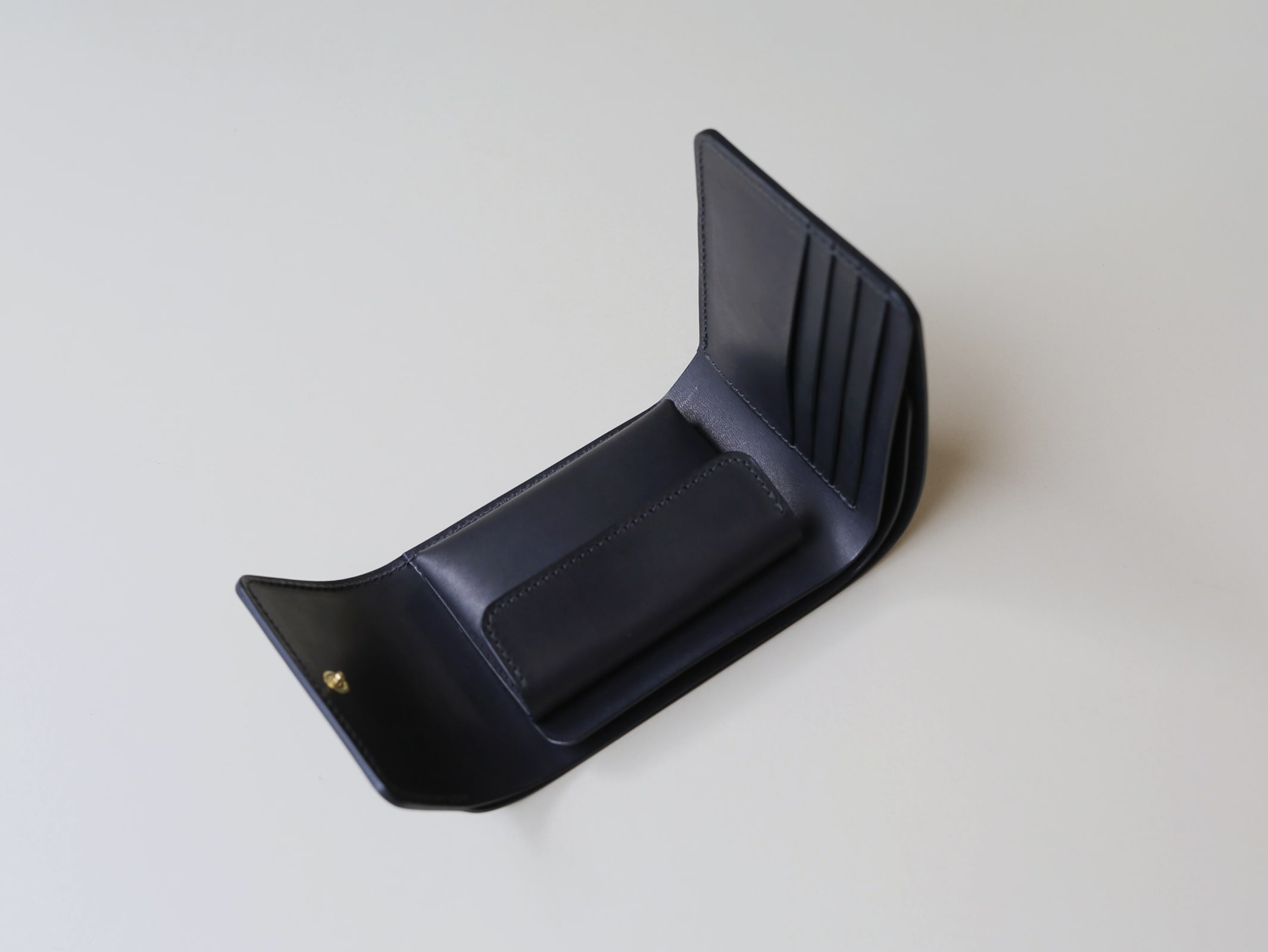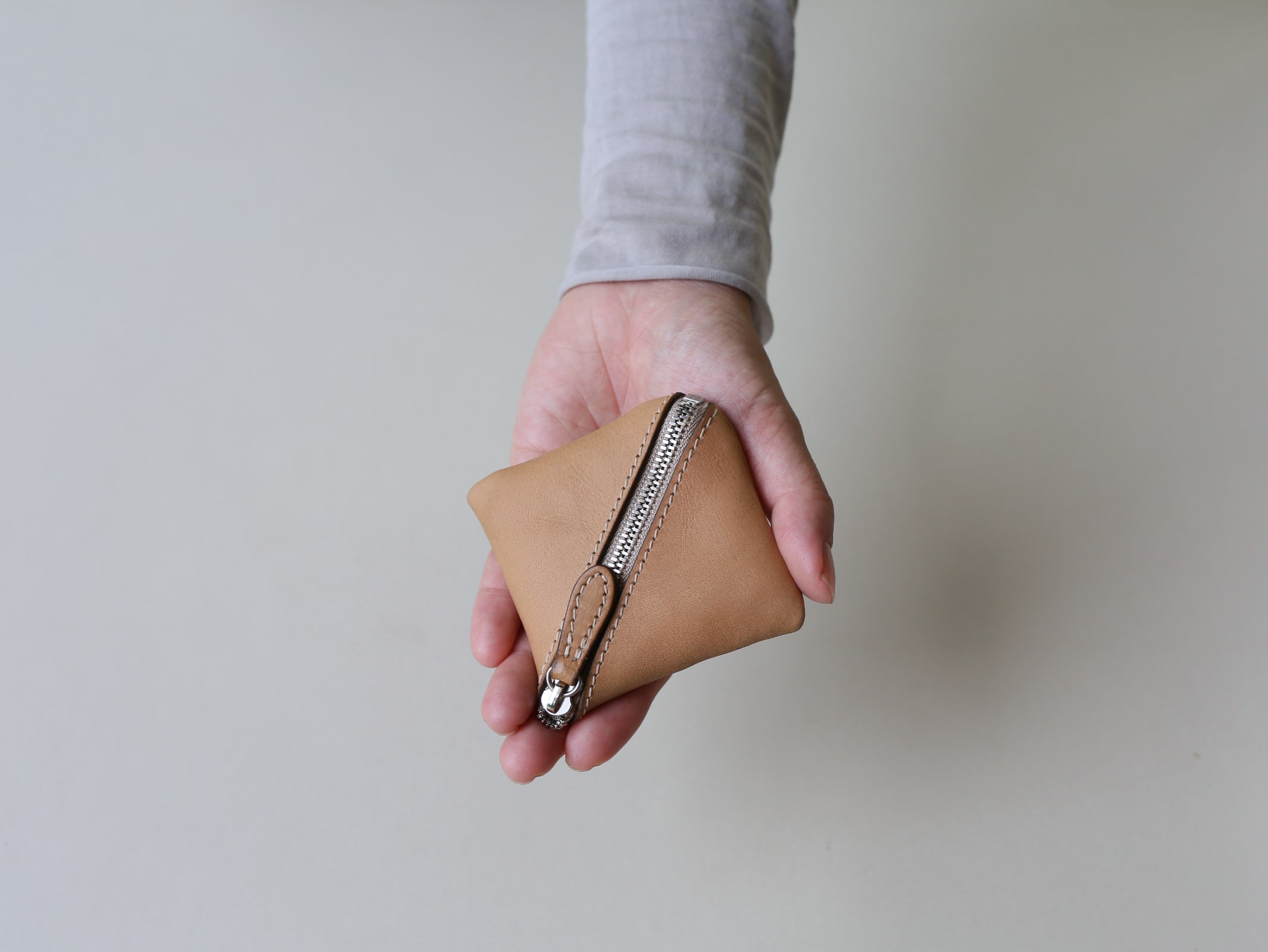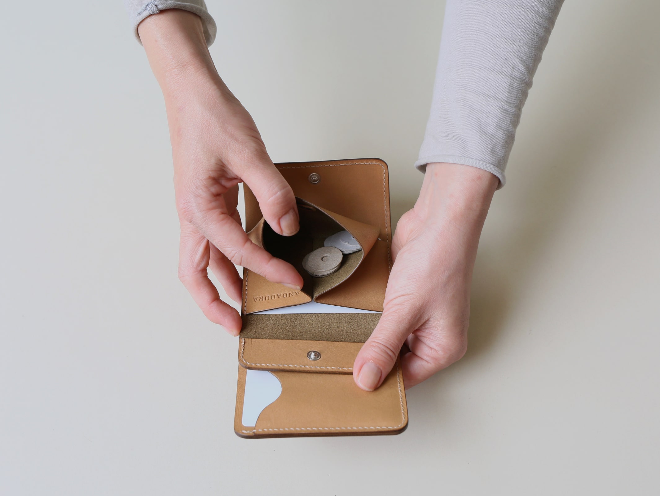 真ん中に小銭れを配置する事で、サイズ感や持った時の安定性、手の動作に沿った