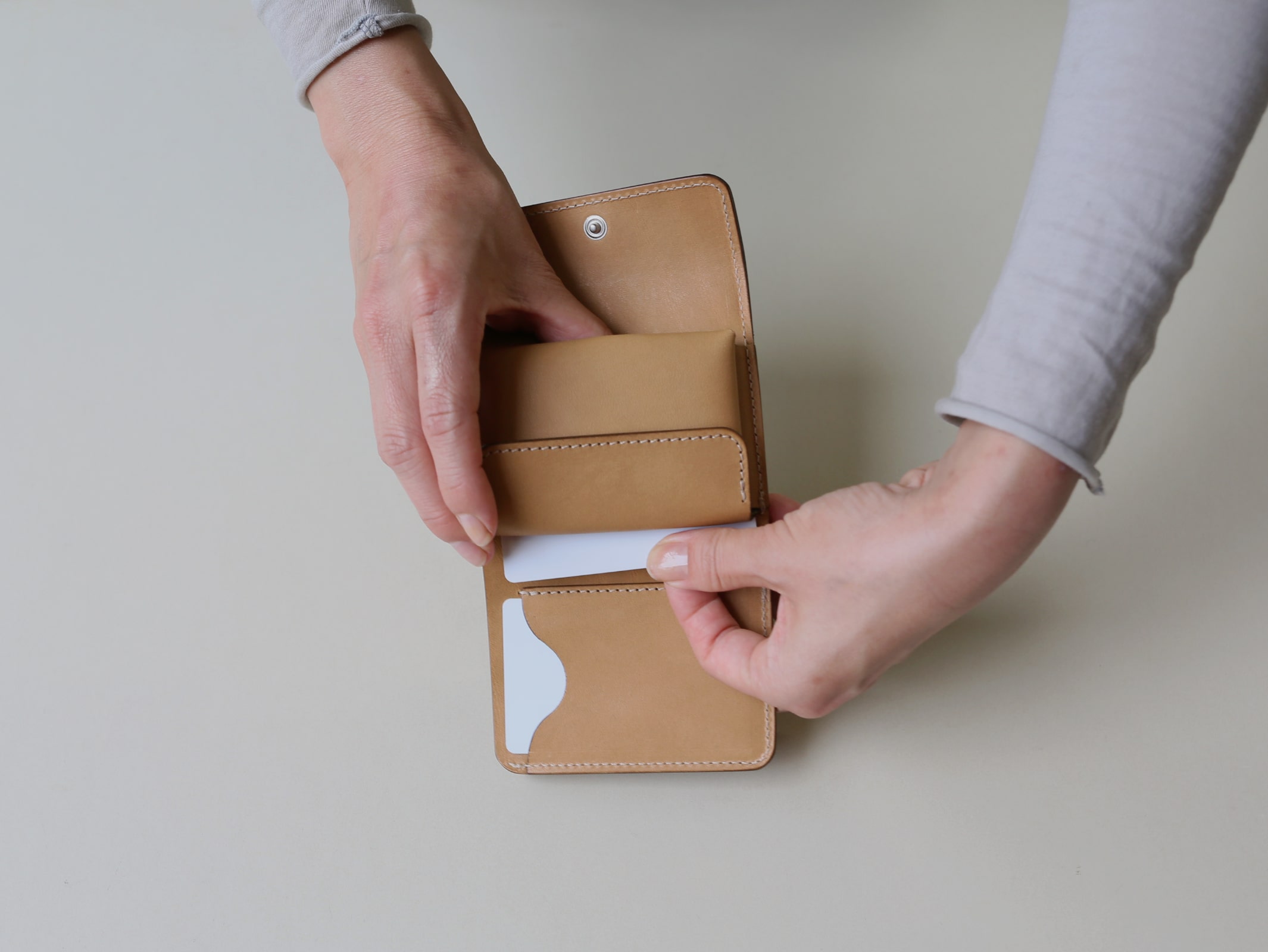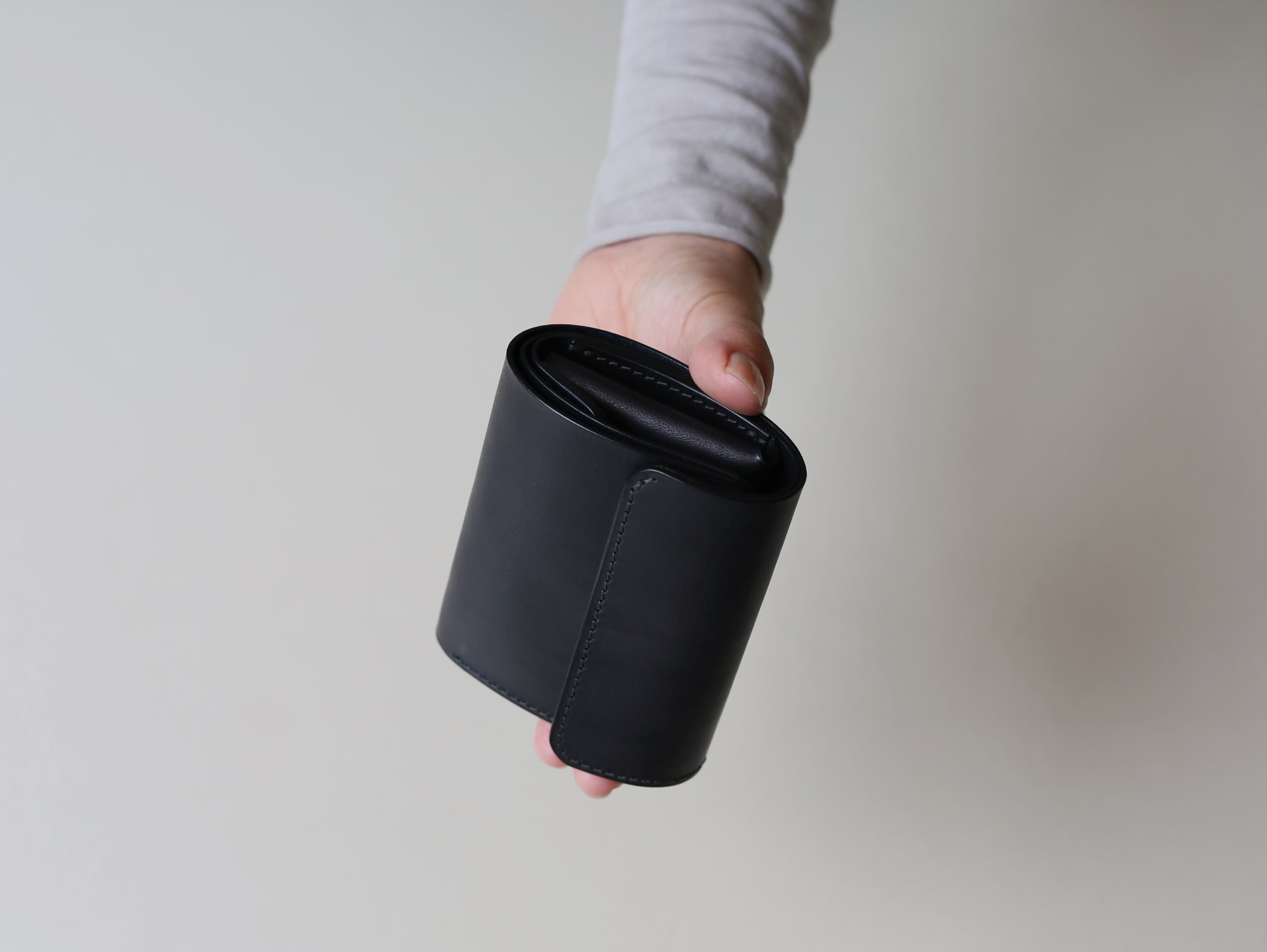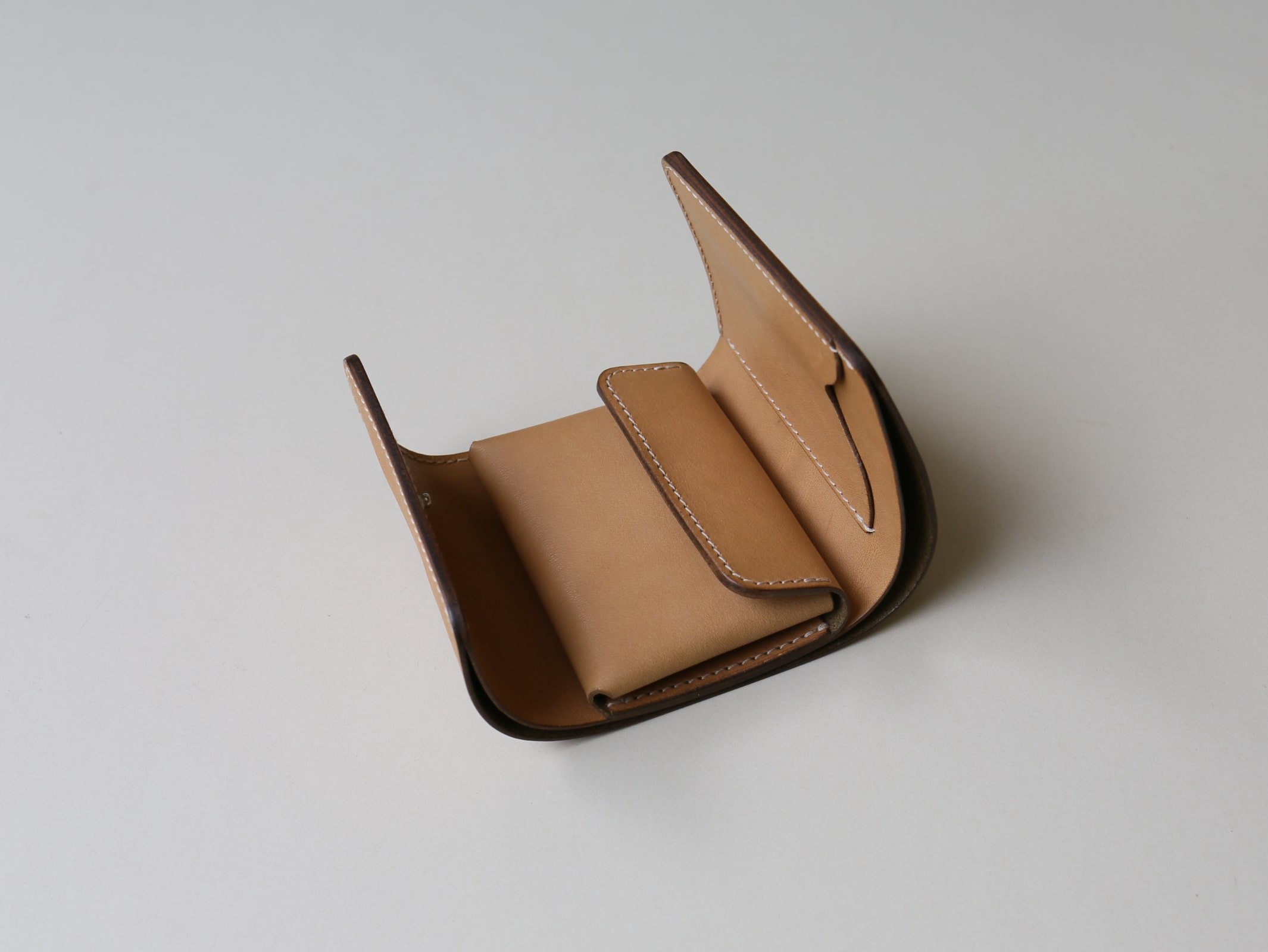 真ん中に小銭れを配置する事で、サイズ感や持った時の安定性、手の動作に沿った