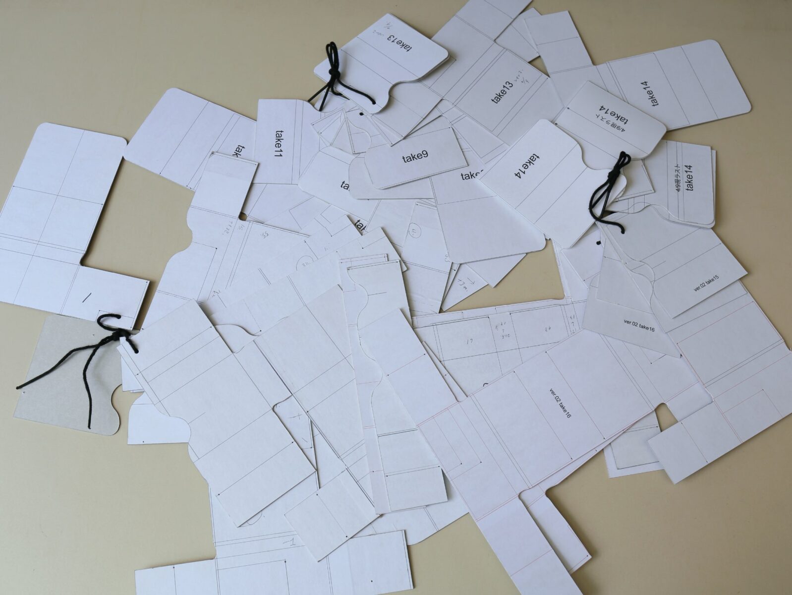制作した無数のサンプルのいくつかは、僕が「新作墓場」と呼んでいるボックスに納められます。サンプルを全てとっておくことはできないので、消化不良だなと感じるものや、今のところよく分からないものを優先して残します。毎回サンプルを制作するたびに、新作墓場はいろんな時間軸を含んだ、豊かなカオスになっていきます。